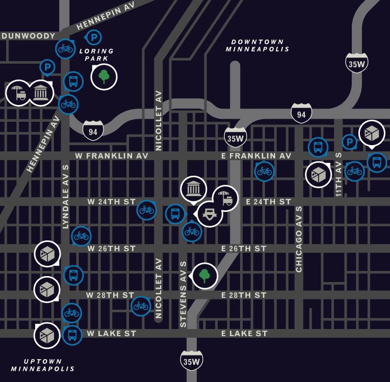 Exhibition “triangle” between Walker Art Center near Hennepin Ave, MIA and MCAD near 3rd Ave S and galleries near Franklin Ave and Lake St.