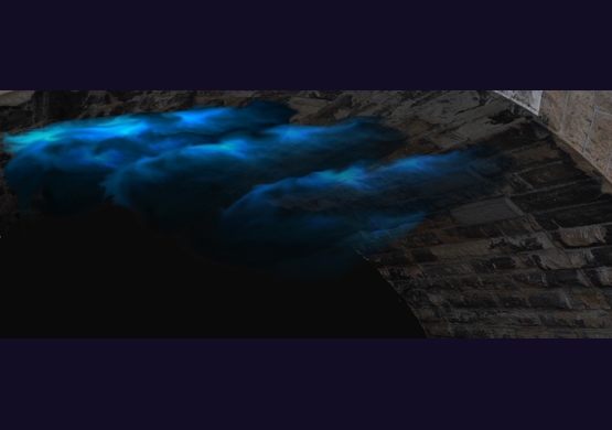 beneath a glowing ceiling veil of living light transforms an arch of the Stone Arch Bridge into a chamber that invites people to experience the bio luminescence that illuminates the night within this space. Glowing plankton inhabit a membrane of soft vessels filled with seawater. Together they form a liquid veil suspended within the arch. The plankton are in tune with the night phase of their cycle, ready to luminescence in response to small and grand movements of the water in which they dwell. Conceived as an ambient site that is responsive to the presence of people who visit, the water in the soft vessels is animated by delicate vibrations as people enter and experience the chamber. There is a sense that the glowing light is responsive to people’s movement within the space and at the same time this relationship is subtle, suggesting the emergence of a collaborative atmosphere that shifts with the flow of people.