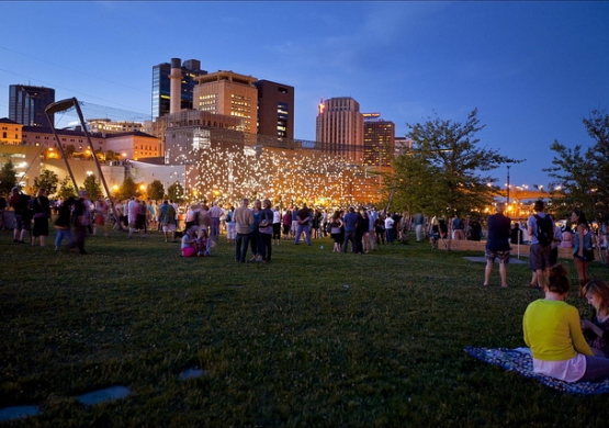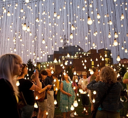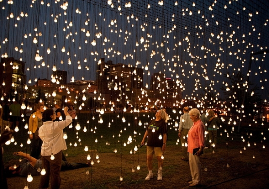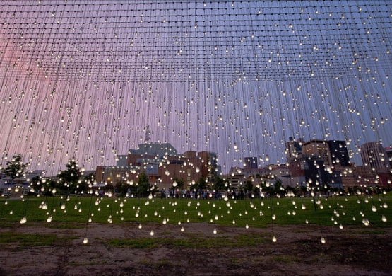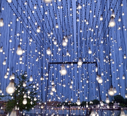 Scattered Light features more than 1,600 LEDs encased in standard light bulbs suspended within a support structure spanning 80 feet in length and standing 20 feet high and 16 feet deep to create a vibrant grid of lights. The LED bulbs are programmed so that, depending on a viewer’s vantage point, they “play back” in very low resolution a video of commuters in Grand Central Station. From other points of view, the outdoor sculpture is just scattered light.