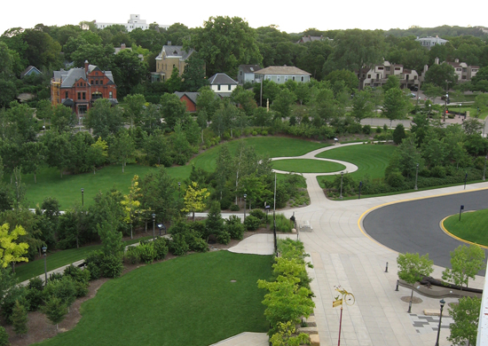 Bowl-shaped open gathering area of the Science Museum of Minnesota’s Big Backyard.
